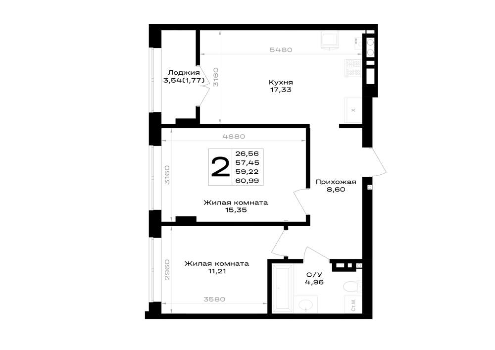 Жилая площадь 26.56 м2, кухня 17.33 м2, предчистовая отделка.