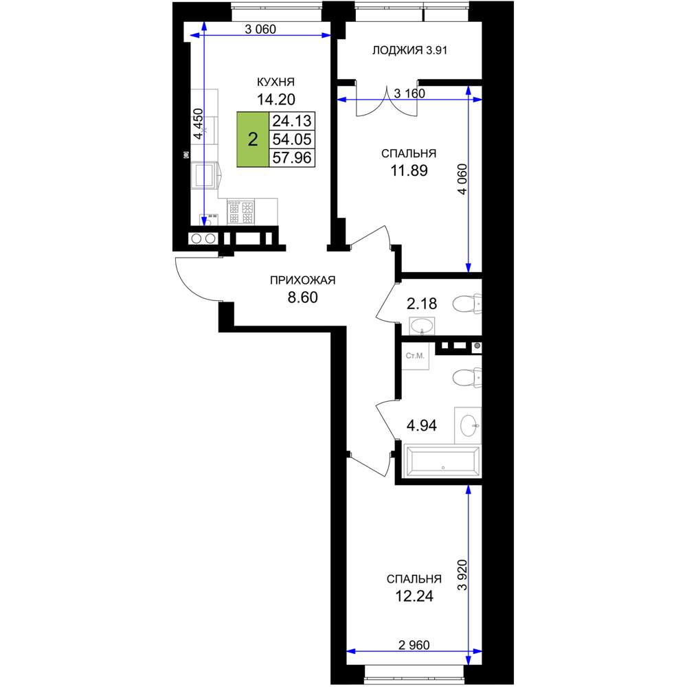 Жилая площадь 25.06 м2, кухня 14.4 м2, предчистовая отделка.