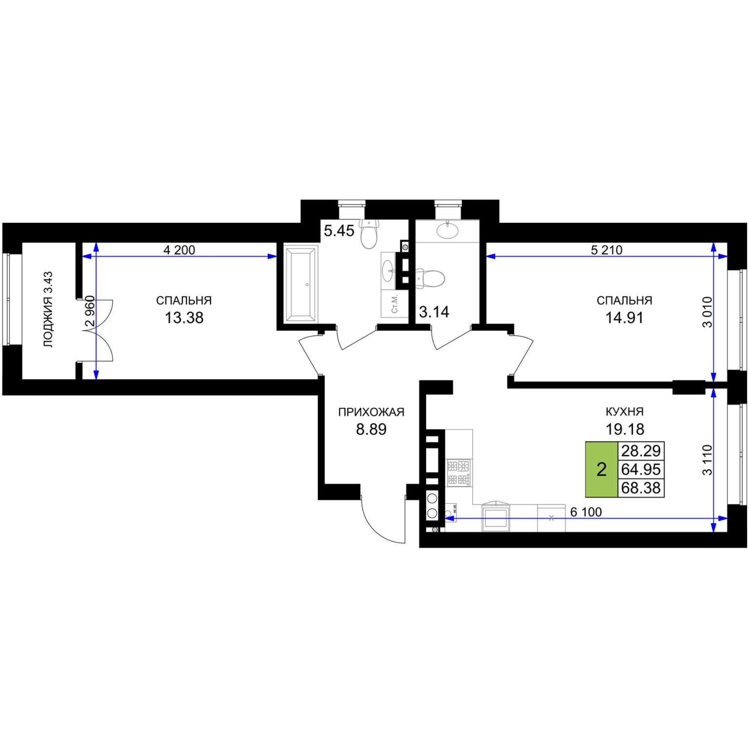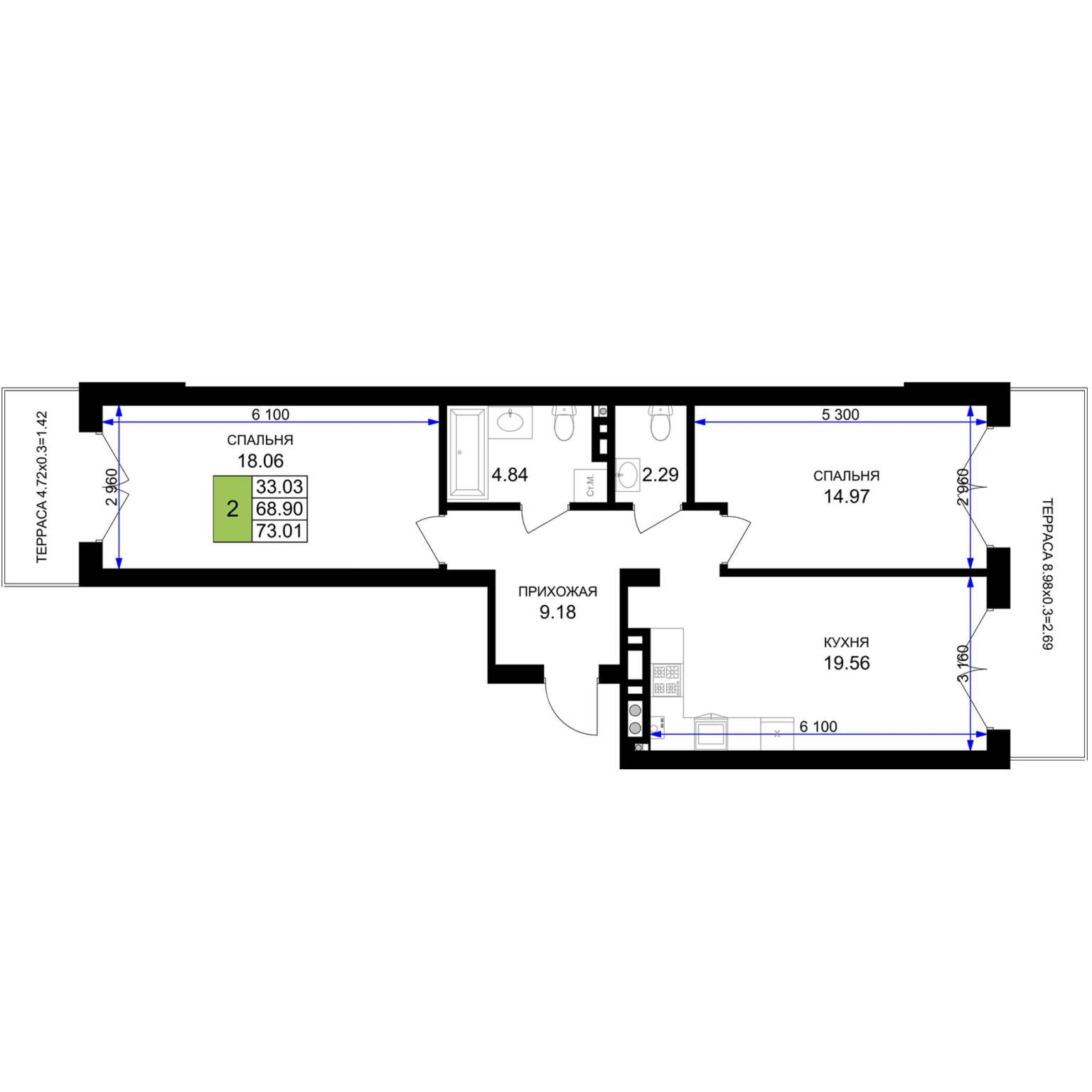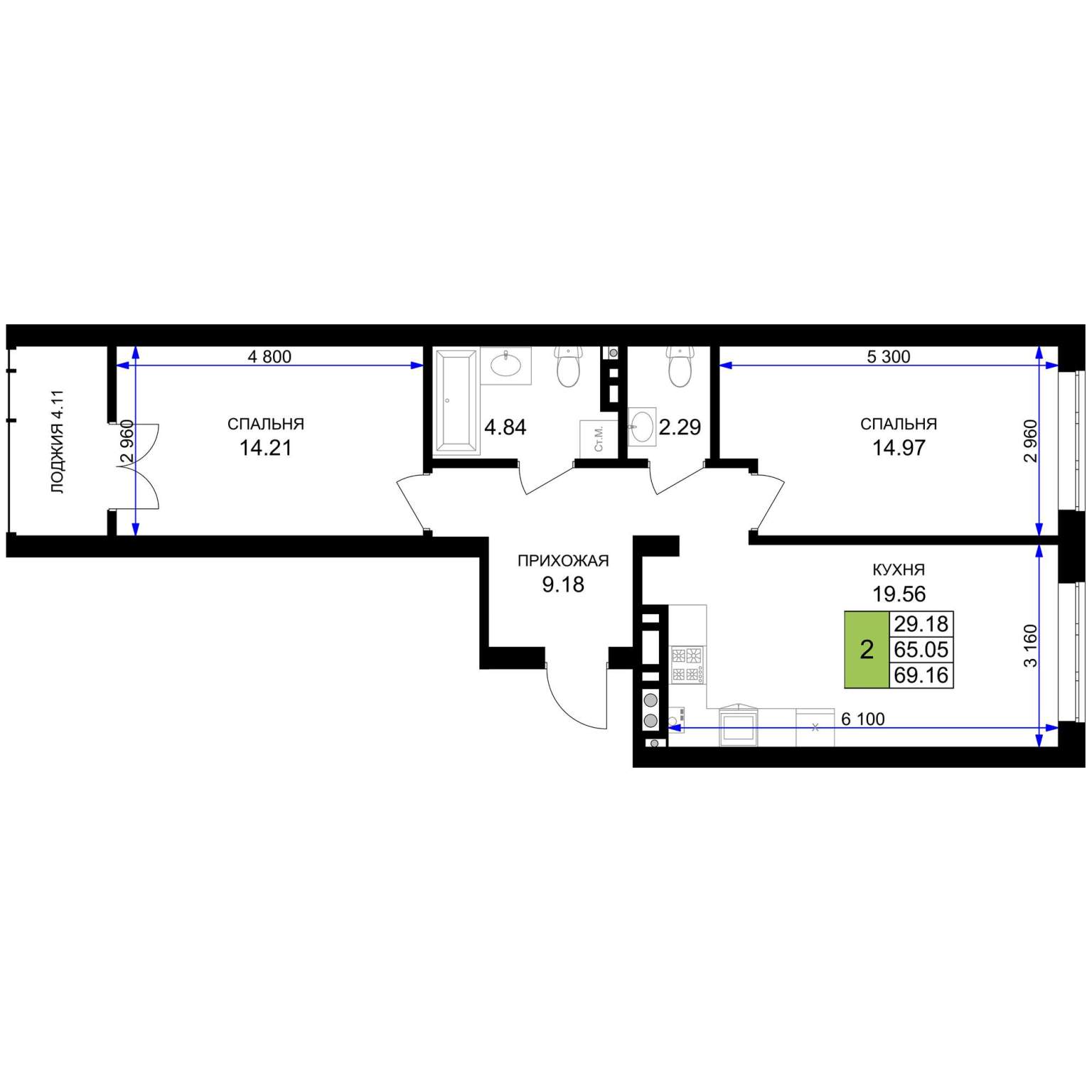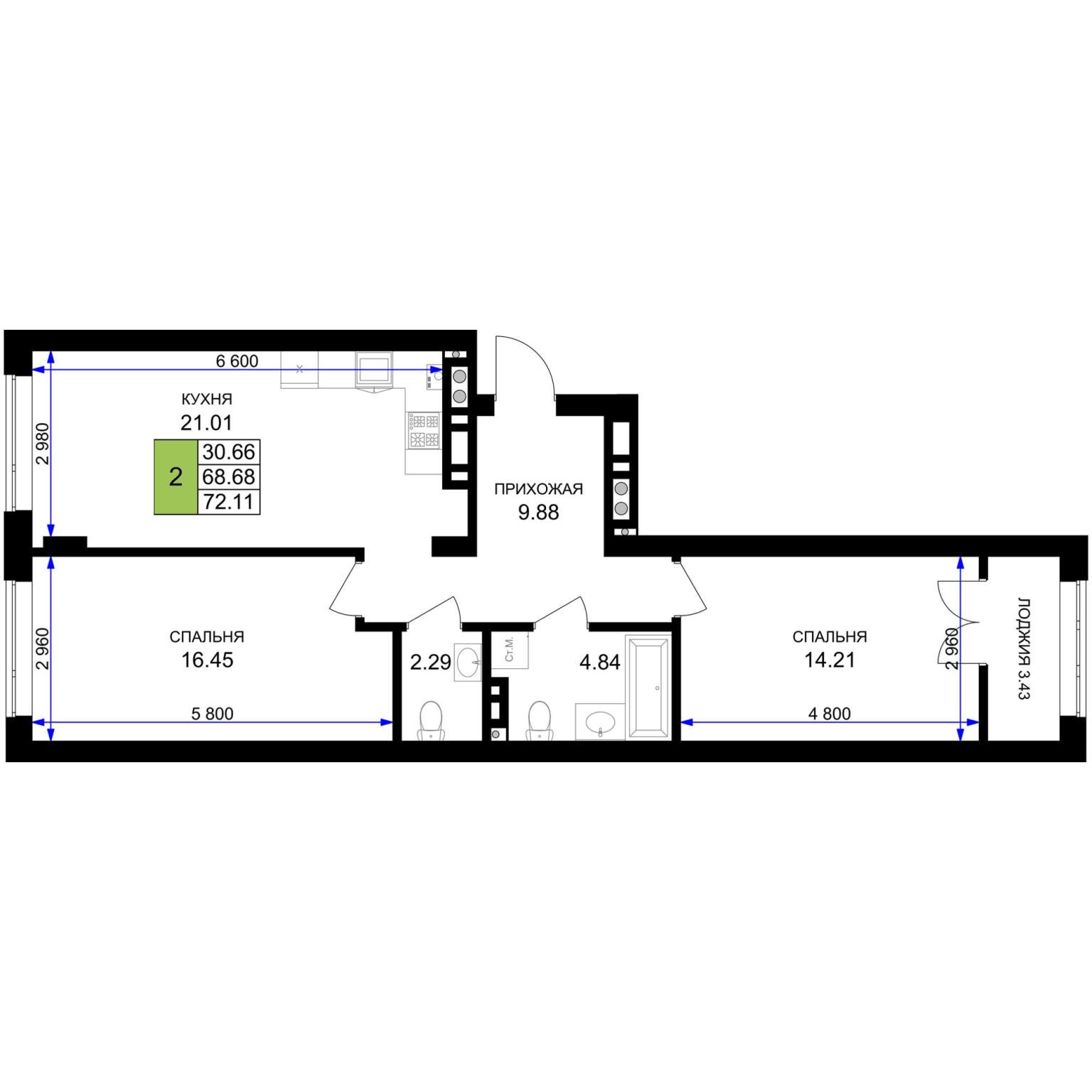 Жилая площадь 29.81 м2, кухня 31.52 м2, предчистовая отделка.