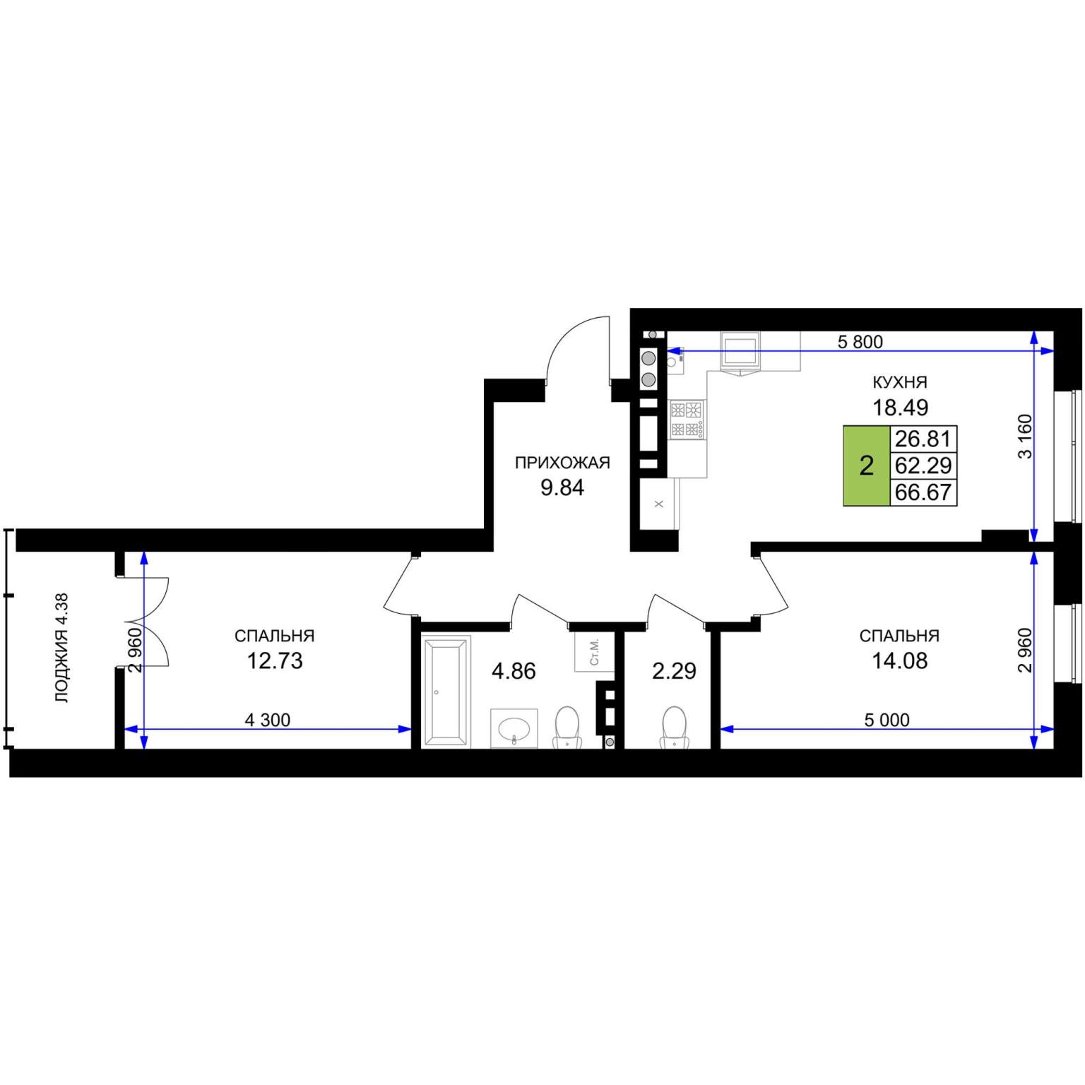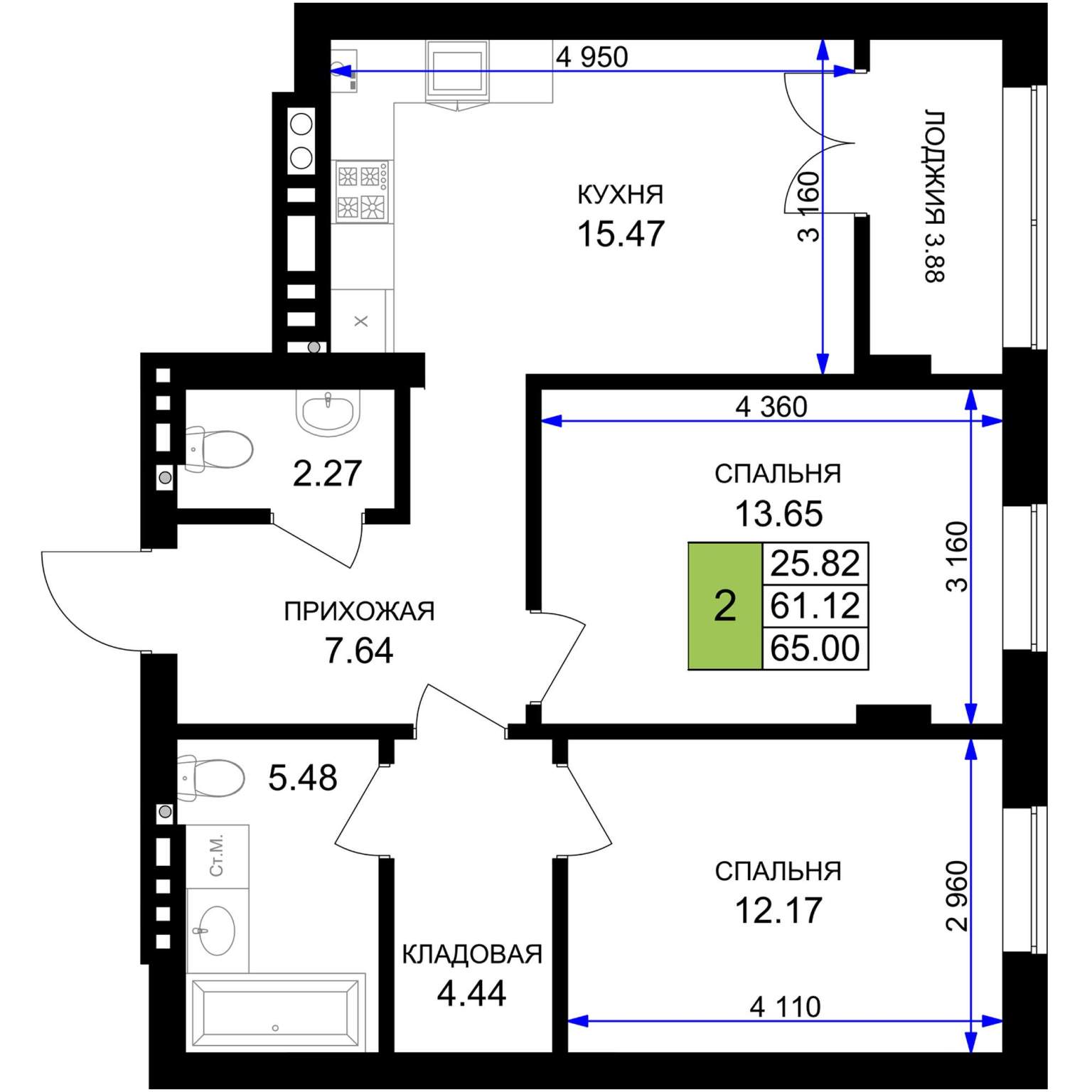 Жилая площадь 25.82 м2, кухня 15.47 м2, предчистовая отделка.