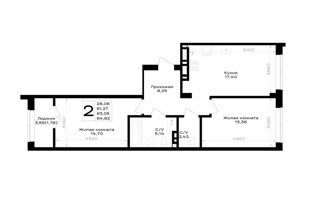 Жилая площадь 28.06 м2, кухня 17.4 м2, предчистовая отделка.