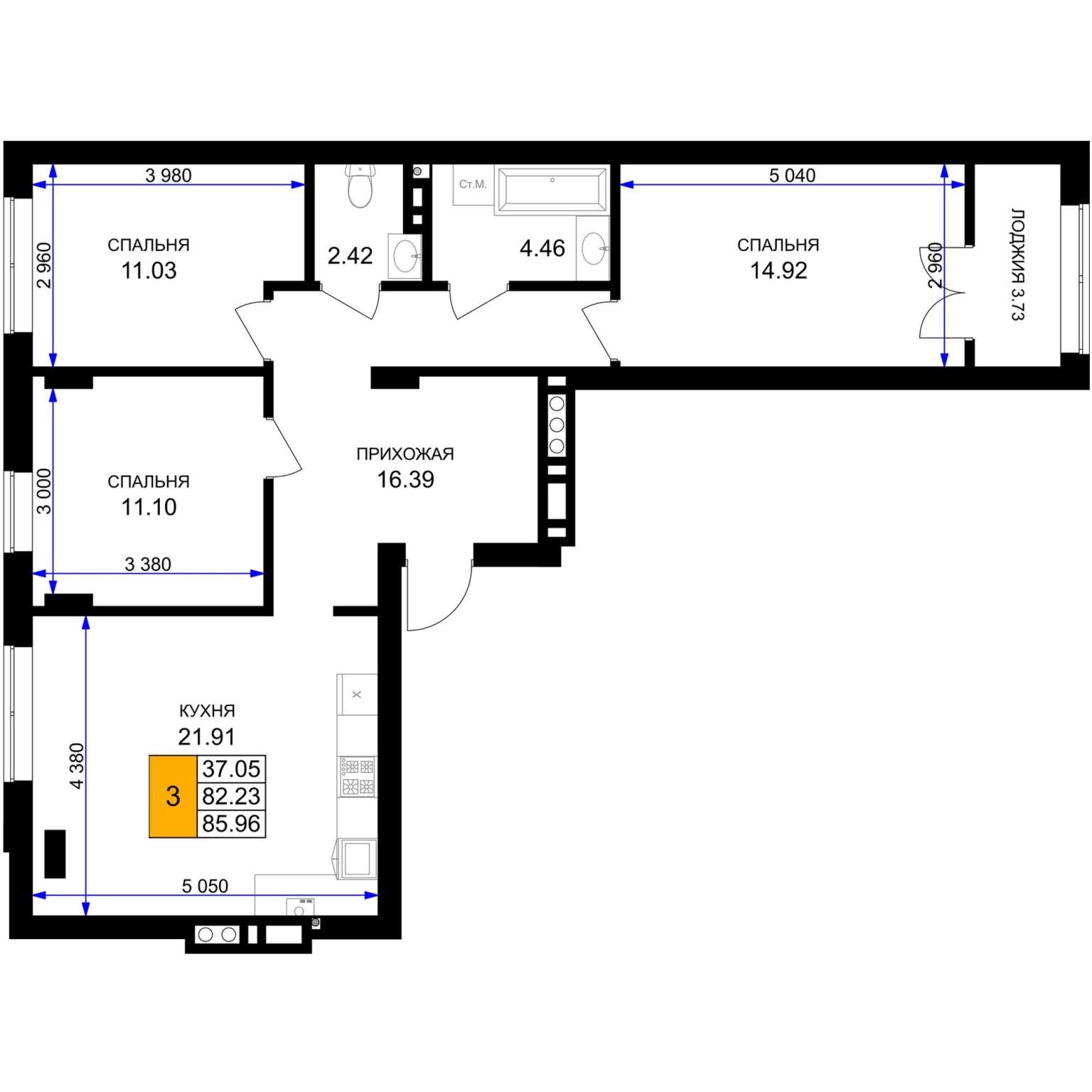 Жилая площадь 37.72 м2, кухня 19.44 м2, предчистовая отделка.