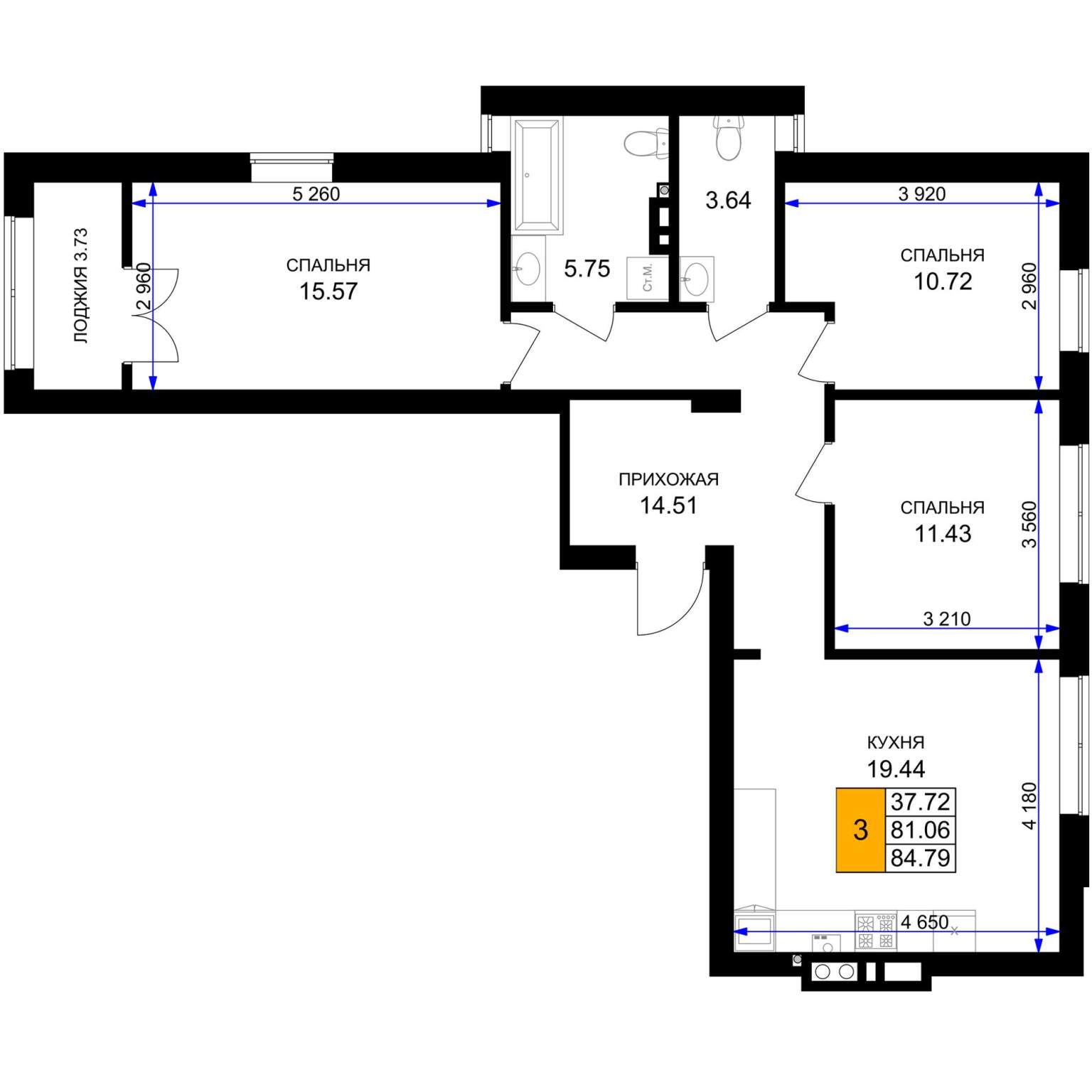 Жилая площадь 41.62 м2, кухня 19.44 м2, предчистовая отделка.