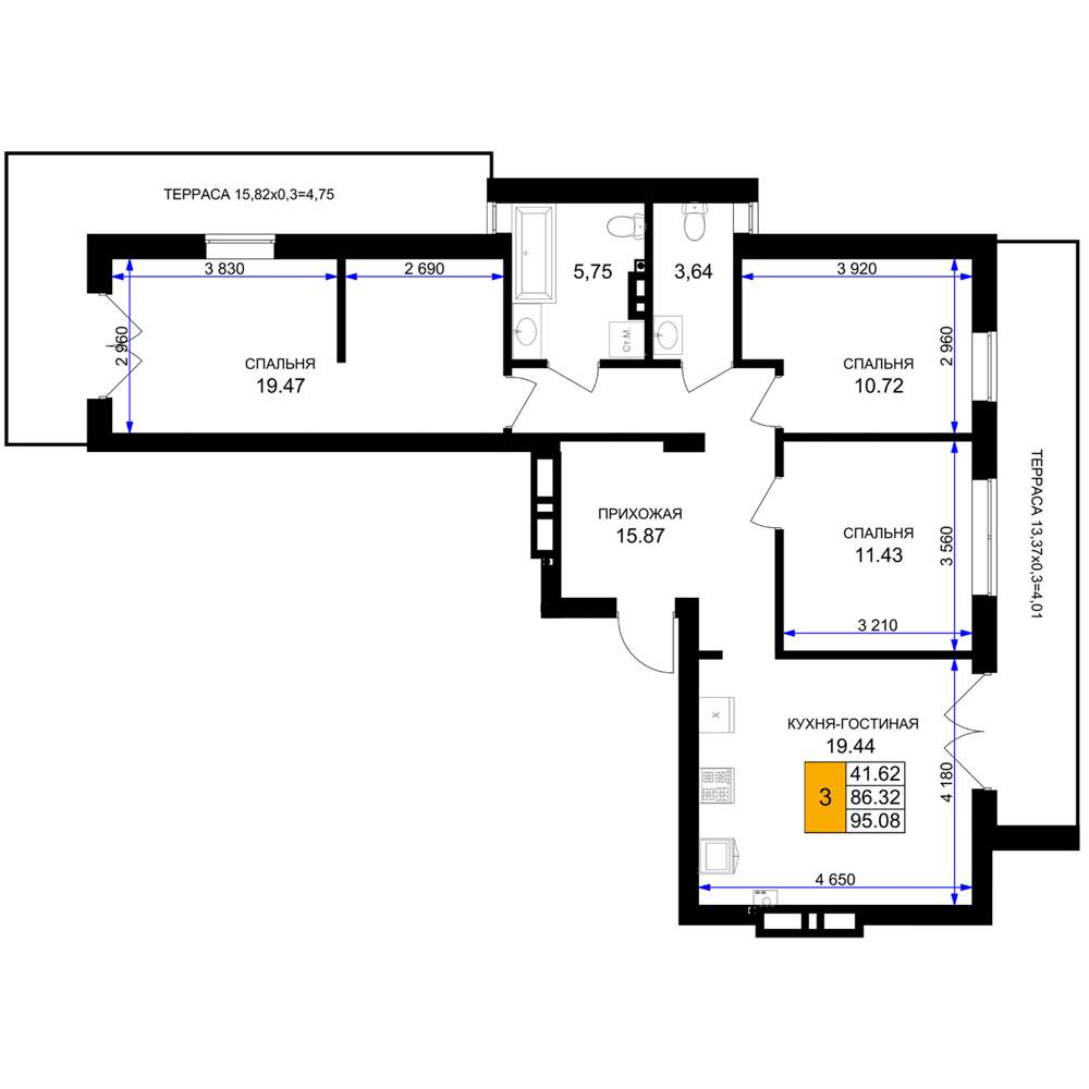 Жилая площадь 45.47 м2, кухня 24.99 м2, предчистовая отделка.